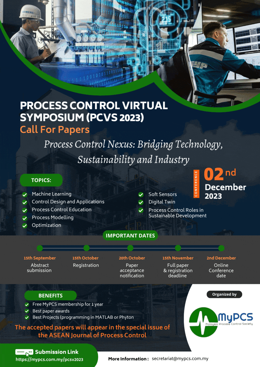 All papers are subject to peer review. The accepted papers will appear in the special issue of the ASEAN Journal of Process Control (eISSN: 2976-4009). The presentation and publication are MYR 50.00.